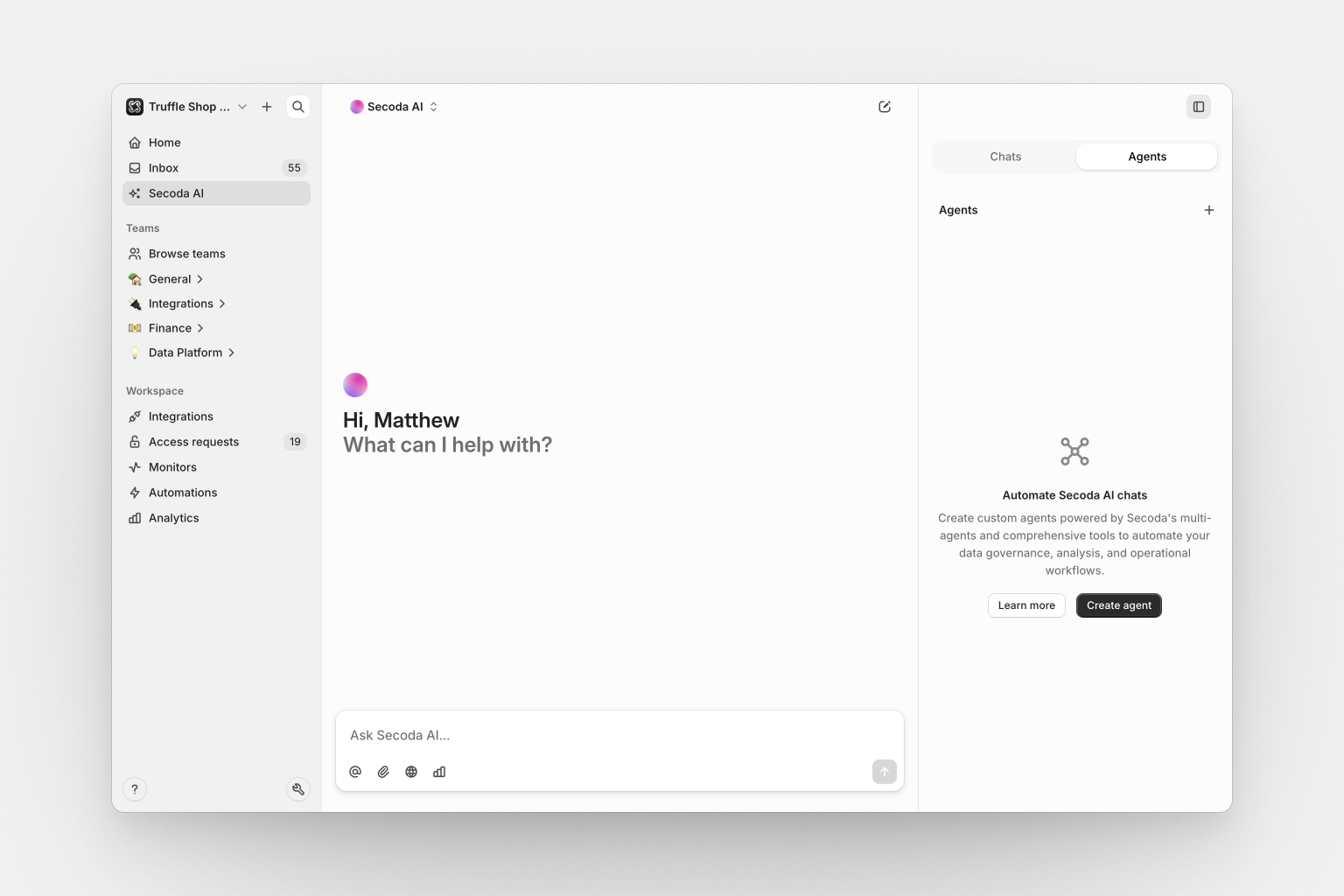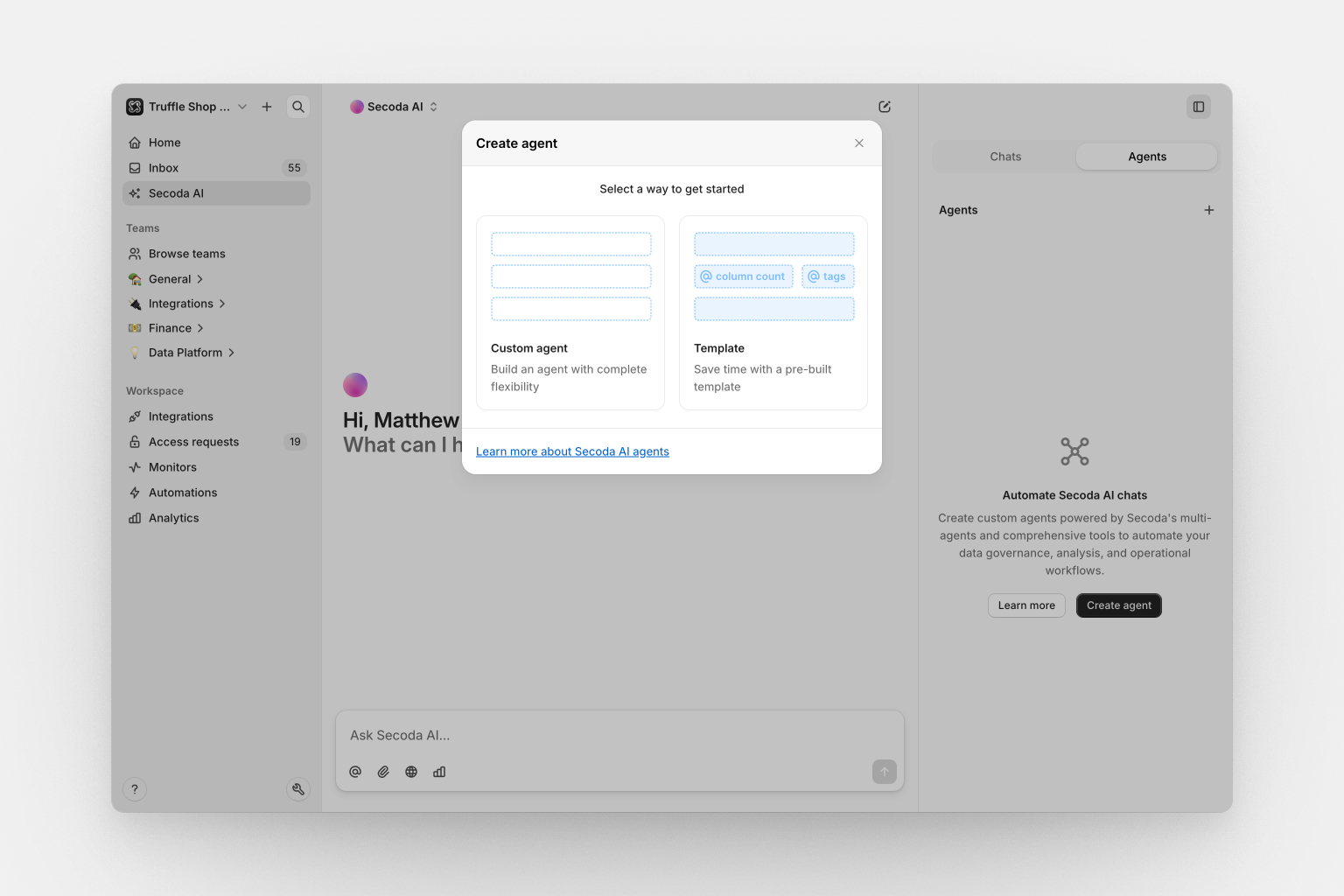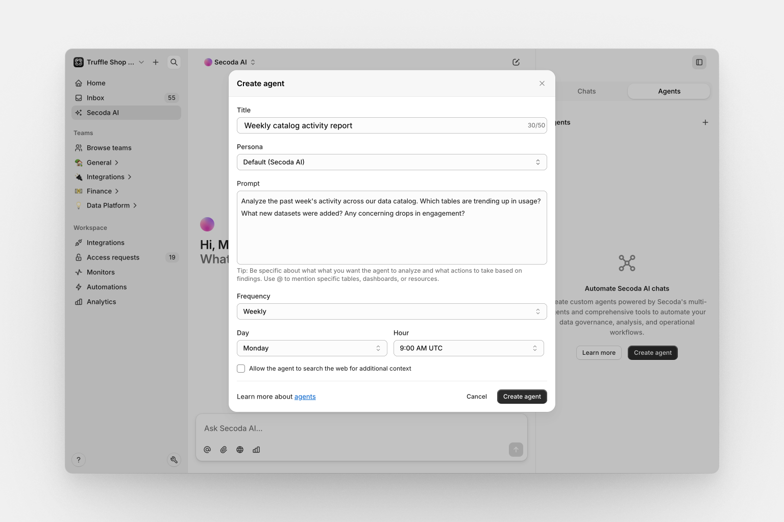 Agents let you schedule recurring runs of your most useful Secoda AI conversations. When you have a productive chat with Secoda AI and get valuable insights, you can convert that specific prompt into an agent that runs on your preferred schedule - daily, weekly, or with custom cron schedule. They leverage Secoda's full multi-agent system and tools under the hood, giving you the same powerful analysis capabilities on autopilot.