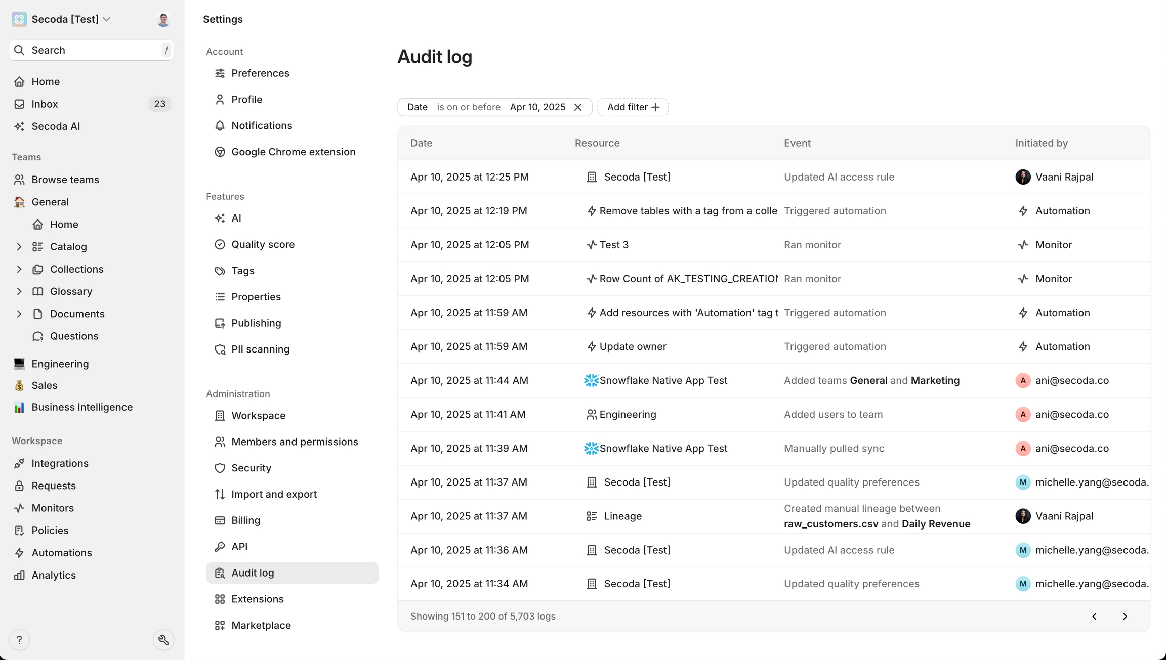 The Audit Log provides a comprehensive timeline of all activities and changes made within your Secoda workspace. This feature helps you track user actions, monitor changes, and maintain accountability across your data documentation.