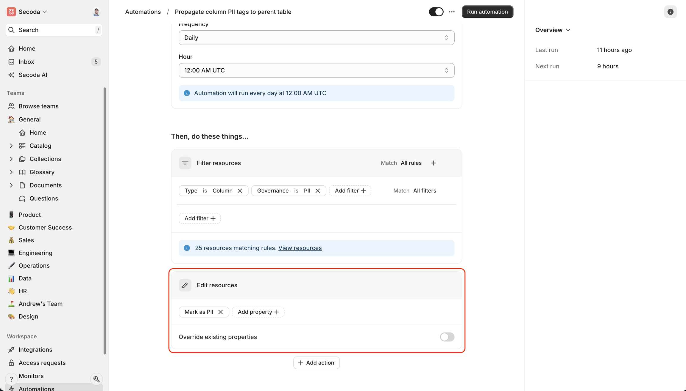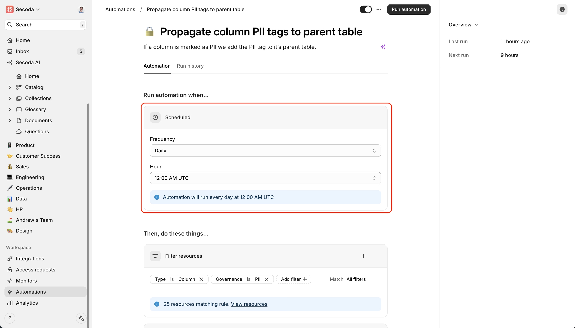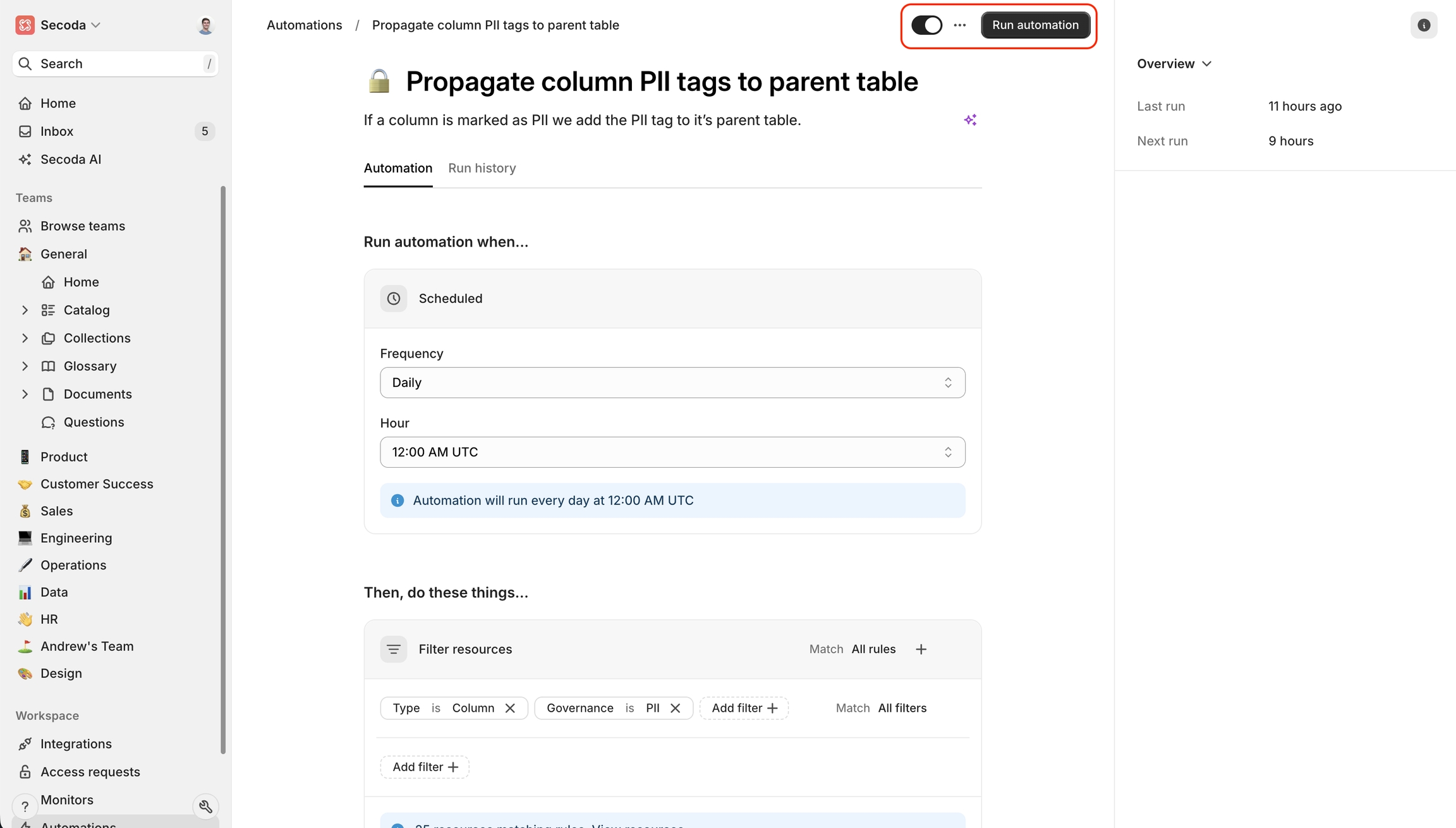 Automations in Secoda enable Admins to set up rule-based operations that automate routine data management tasks, much like Zapier. This feature significantly saves time by automating updates to metadata and documentation with the option to incorporate AI for tasks such as generating descriptions, tagging, and classification. By reducing manual effort, teams can focus on more strategic initiatives while improving both productivity and accuracy in data management.