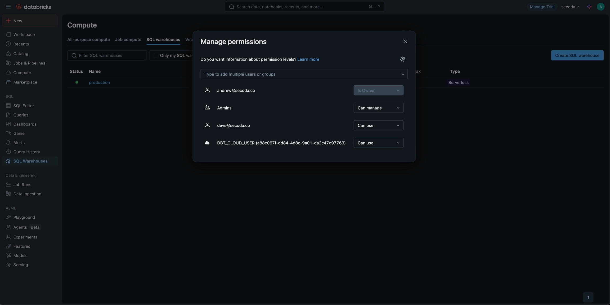 permissions (set via SQL Warehouses > [My Warehouse] > Permissions