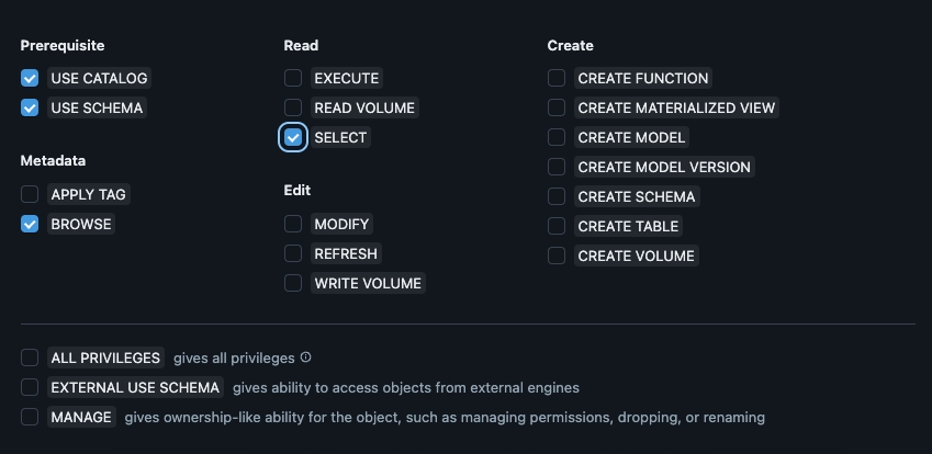 For each catalog you want to connect to Secoda, the credentials must have the following permissions: