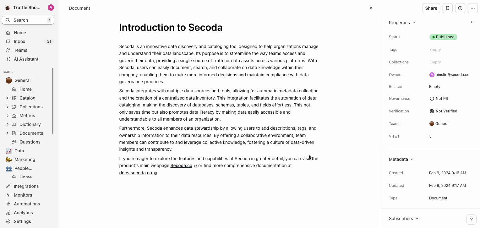 Create a Document in that Team and title it something along the lines of "Introduction to Secoda" or "What is Secoda?"